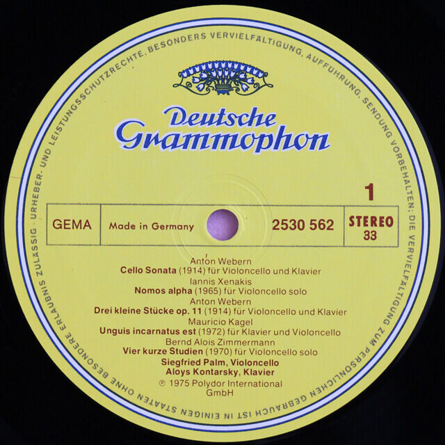 パルム/チェロ・リサイタル(ウェーベルン、クセナキス、カーゲル、ペンデレツキほか) DE DGG 2530 562 STEREO 2026年02月04日 23:55 20世紀チェロ音楽のアンソロジー。極めて解像度が高く、チェロの質感をリアルに捉えた超優秀録音として長岡鉄男が絶賛した現代音楽の名盤として知られています。 2/4Today's Topicsヤニス・クセナキスIannis Xenakisが没した日(2001年)。20世紀を代表するこの作曲家は、国立西洋美術館を建てたことでも知られるル・コルビュジエLe Corbusier(本名はシャルル=エドゥアール・ジャヌレ=グリCharles-Édouard Jeanneret-Gris, フランク・ロイド・ライト、ミース・ファン・デル・ローエと共にモダニズム建築の三大巨匠の一人)の弟子でもあった。独自の才能・アイデアを発揮した、ブリュッセル万博の折にクセナキスが設計したフィリップス館は印象的。モデュロール理論の発案、窓枠や格子のプロポーショナルな配置などについて、彼の数学的考案はパリ音楽院で作曲をオリヴィエ・メシアンらに師事したときメシアンに「君は数学を知っている。なぜそれを作曲に応用しないのか。伝統的な修練は、あってもなくても同じではないか」と言われ、その慧眼に強い霊感を受けた。その高度な数学知識を作曲に応用し、管弦楽作品「メタスタシス」など、独自のスタンスを築いた。ジョン・ケージの影響を受けなかった現代音楽作曲家唯一の稀代の存在。コンピュータを使った確率論的手法で多くの斬新な作品を生み出し、日本万国博覧会では、『ヒビキ・ハナ・マ』(響き、花、間)(1969年)という日本語の題を持つ多チャンネル360度の再生装置を伴う電子音楽を発表した。ほかに会場内に奏者がランダムに配置される管弦楽曲『ノモス・ガムマ』と、照明演出を伴う電子音楽『ポリトープ』が代表される。極みのヴィンテージ名盤DE DGG 2530 562 ジークフリート・パルム チェロ・リサイタル切り開かれたチェロの沃野現代音楽の解釈で世界的に知られ、チェリストのグレゴール・ピアティゴルスキーやムスティスラフ・ロストロポーヴィチに匹敵するほど、同世紀の音楽に多大な影響を与え、チェロを現代音楽において最も重要なソロ楽器のひとつに発展させた。カーゲル、リゲティ、クセナキス、ペンデレツキ、ツィンマーマンなど、20世紀の多くの作曲家が彼のために曲を書いている。リューベック、ハンブルク、ケルンなどのオケの首席奏者を歴任した名手で、数多くの同時代音楽の生みの親でもあるパルムによる20世紀チェロ音楽のアンソロジー(収録作品の半数が彼に献呈)。高い技術と徹底した集中力が作品の存在意義を倍加させている。ジークフリート・パルム(独チェリスト)1927年4月25日、ドイツのバルメン(現ヴッパータール)生まれ。8歳の時に父親からチェロを習い始め、その後ザルツブルクとルツェルンのマスタークラスでエンリコ・マイナルディに師事した。1945年からリューベックで、1947年からハンブルクのNDR交響楽団でハンス・シュミット=イッセルシュテット指揮で、ケルンのWDR交響楽団で1962年から1968年まで首席チェリストとして活躍した。多くのチェロ協奏曲や現代室内楽曲を初演しており、1951年から1962年までハマーン・クァルテットのメンバーを務めた。1962年から1983年までピアニストのアロイス・コンタルスキーとデュオを組み、1967年からはガスパール・カサドーの代わりにピアノトリオ、ロスタル/シュレッター/パルムのメンバーとして活躍した。1962年にはケルン音楽大学(当時は国立音楽大学)のチェロのマスタークラスの講師となり、1972年から1976年まで同学院の学長を務めた。1976年から1981年までベルリン・ドイツ・オペラの館長を務めたほか 1982年から1988年まで国際現代音楽協会(ISCM)会長、1988年から2000年までドイツ・フランツ・クルトゥラート会長を務めた。バーデンバーデンのカール・フレッシュ・アカデミー、カナダのバンフ芸術センター、ストックホルム王立音楽院(1966年)、ダートマス大学(1969年)、マールボロ大学(1970年から1990年の間に数回)、ヘルシンキのシベリウス・アカデミー(1971年)、ロサンゼルス(1983年)など世界各地でマスタークラスやワークショップを行った。また国際コンクールの審査員も務めた。 ヴィンテージレコードの写真 プロダクト・ディテール(ヴィンテージ盤)レーベルDeutsche Grammophonレコード番号2530 562作曲家Side-AAnton WebernIannis XenakisAnton WebernMauricio KagelBernd Alois ZimmermannSide-BKrzysztof PendereckiEarle BrownIsang Yun楽曲Side-Aチェロ・ソナタ (1914) / Cello Sonata (1914) für Violoncello und Klavierノモス・アルファ (1965) / Nomos Alpha (1965) für Violoncello solo (Dedicated to Siegfried Palm)3つの小品 作品11 (1914) / Drei kleine Stücke, Op. 11 (1914) für Violoncello und Klavierウングイス・インカルナートゥス・エスト (1972) / Unguis incarnatus est (1972) für Klavier und Violoncello4つの短い練習曲 (1970) / Vier kurze Studien (1970) für Violoncello solo (Dedicated to Siegfried Palm)Side-Bジークフリート・パルムのためのカプリッチョ (1968) / Capriccio per Siegfried Palm (1968) für V
