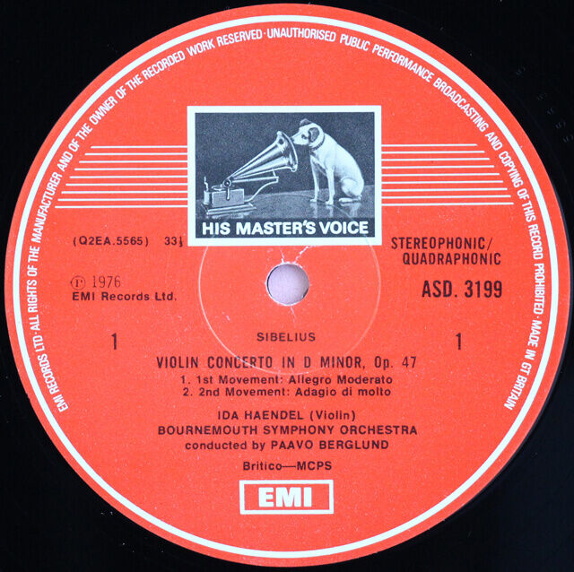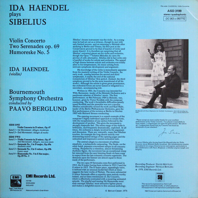 1975年録音の高名なシベリウス・ヴァイオリン協奏曲(ASD3199)のデジタル・リマスター盤では、カップリングは「2つのセレナード」、「ユーモレスク5番」からウォルトンの《ヴァイオリン協奏曲》に変更されています。80歳代になっても第一線で活躍し続けた彼女は、その長いキャリアにも関わらず、録音の少ないことで有名です。イダ・ヘンデルの協奏曲の録音の中でも特別に有名な一枚です。オリジナル盤は入手難!